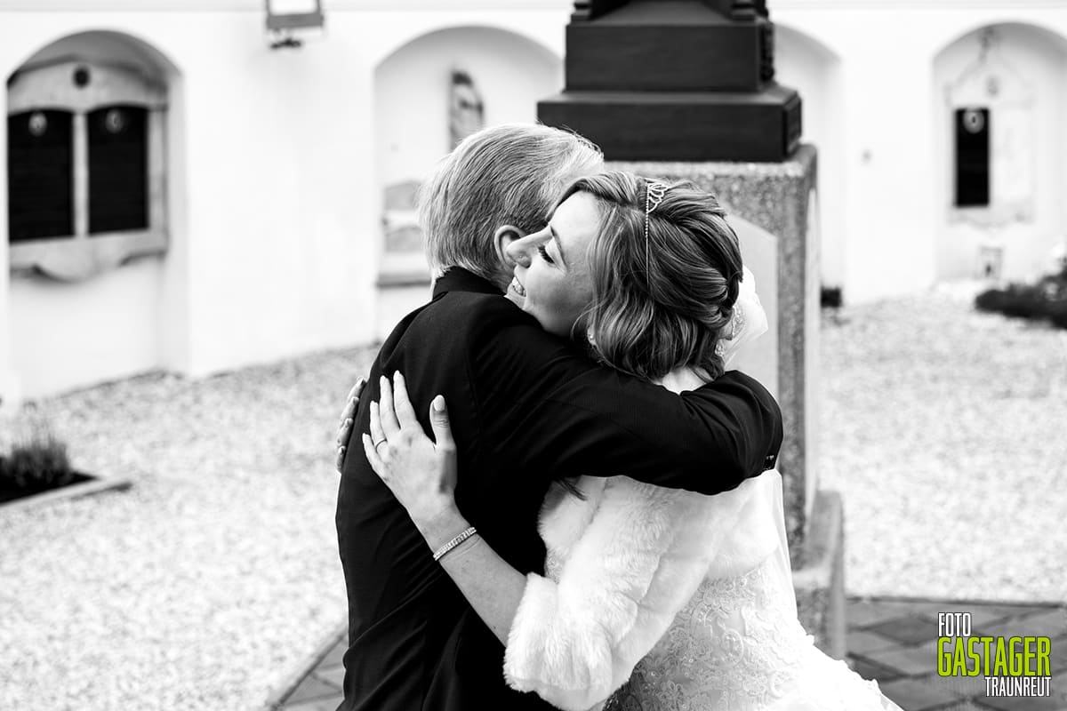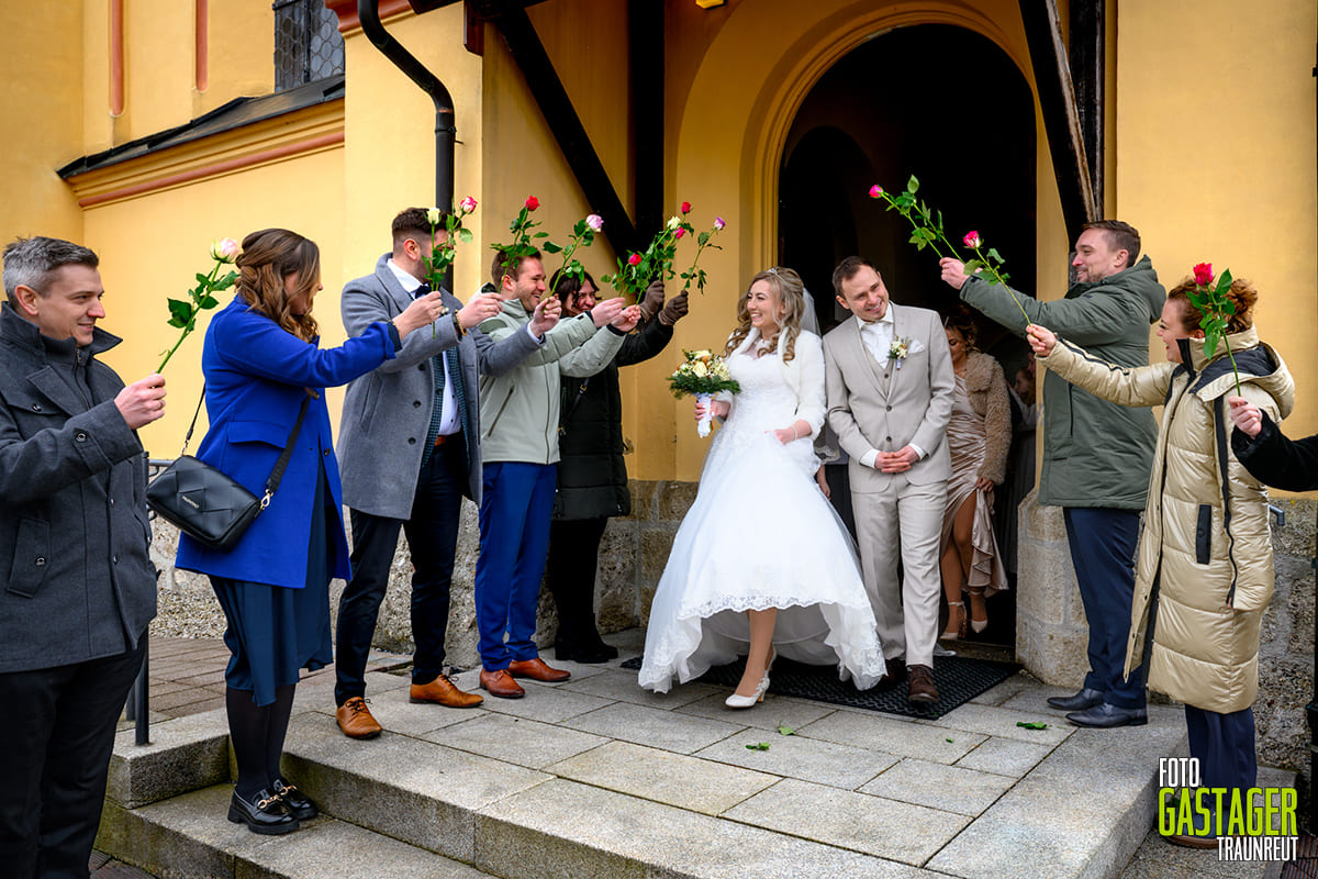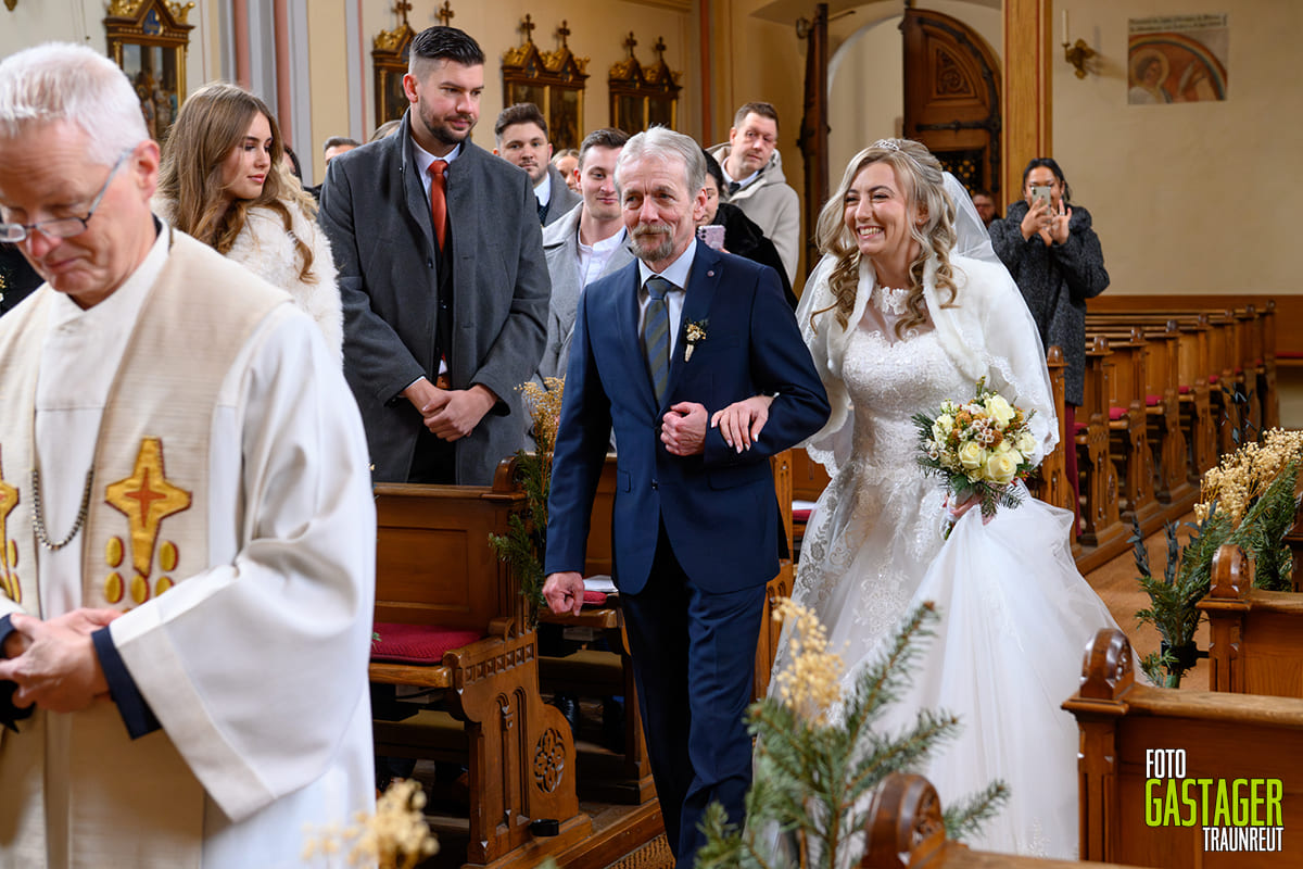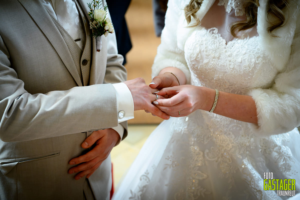 Die feierliche Zeremonie fand in der Kirche in Chieming statt, einem Ort, der durch seine historische Architektur und warme Atmosphäre besticht. Die winterliche Stimmung draußen wurde durch die emotionale Wärme der Trauung perfekt ergänzt. Die Hochzeitsfotografiein Chieming fing die bewegenden Momente ein – vom Einzug der Braut bis zum Austausch der Ringe – die das Paar und die Gäste gleichermaßen berührten.